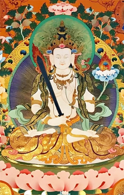圖:文殊菩薩童子一手持劍,另一手持蓮花,蓮花上有經函。