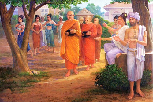 長老闡陀晨朝著衣持鉢,入波羅㮈城乞食。食已,還攝衣鉢,洗足已,持戶鈎,從林至林,從房至房,從經行處至經行處,處處請諸比丘言:「當教授我,為我說法,令我知法、見法,我當如法知、如法觀。」