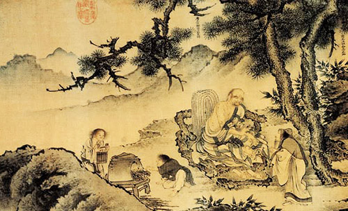 六祖慧能云:「但於自心常起正見,煩惱塵勞常不能染,即是見性」。圖:中坐者為六祖慧能 明 戴進 繪
