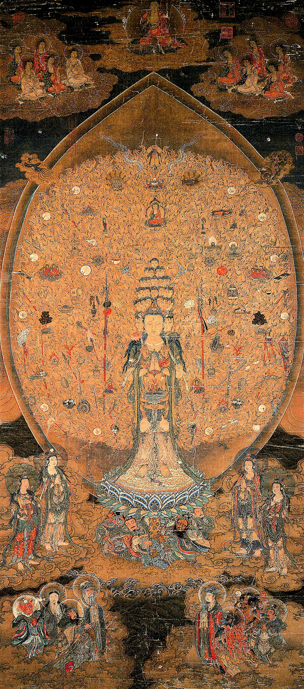 本幅主尊是千手千眼觀世音菩薩。上方雲氣有十方佛,四大天王擎起菩薩足下蓮座,天龍八部兩側隨侍。菩薩嘴角有髭,五官秀美,腰身纖細,容貌已有女性的圓潤溫婉。此觀音有千手各具一眼,或作手印,或執持物,頭頂共具三十二面,頂上面為阿彌陀佛,以示觀音獲得正等正覺,修證圓通無上至道。 多首多臂觀音出自密教,在唐高祖時傳入中國。觀音的頭頂有二十六菩薩面與一佛面,祂共有千手,每隻手中各具一眼,故能以千眼遍識眾生,又以千手隨時救護,充份發揮觀音的悲憫情懷。